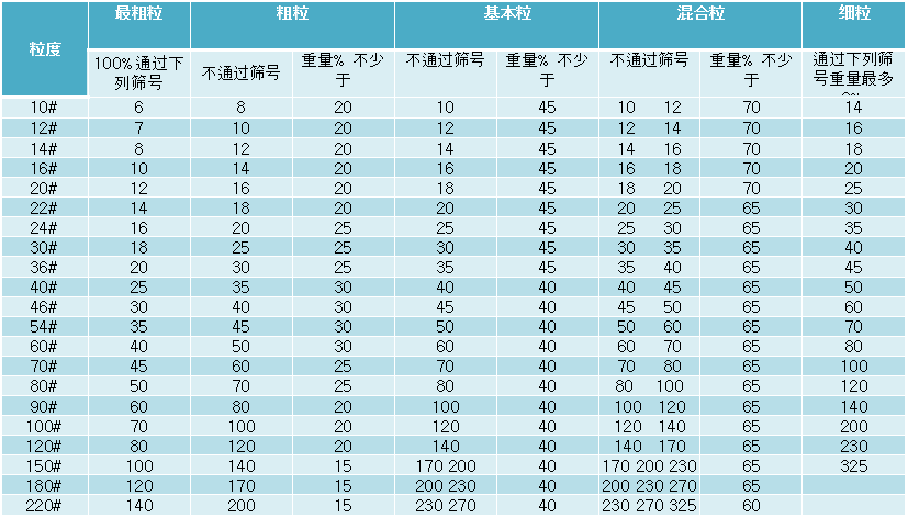 噴砂電熔氧化鋁砂的型號粒度尺寸表: